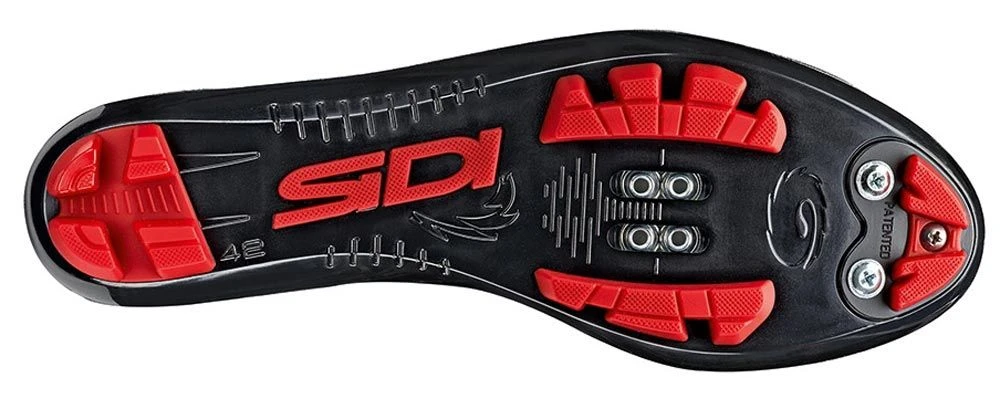 Carbon fiber-reinforced nylon sole with grippy plastic inserts and rubberized SIDI logo in the midsole area, for optimum traction in running passages and more safety when entering the pedal. Exchangeable thread inserts in the cleat area, additional inserts for optional studs. Compatible with all standard MTB pedal systems. Interchangeable profile insert in the toe area.
